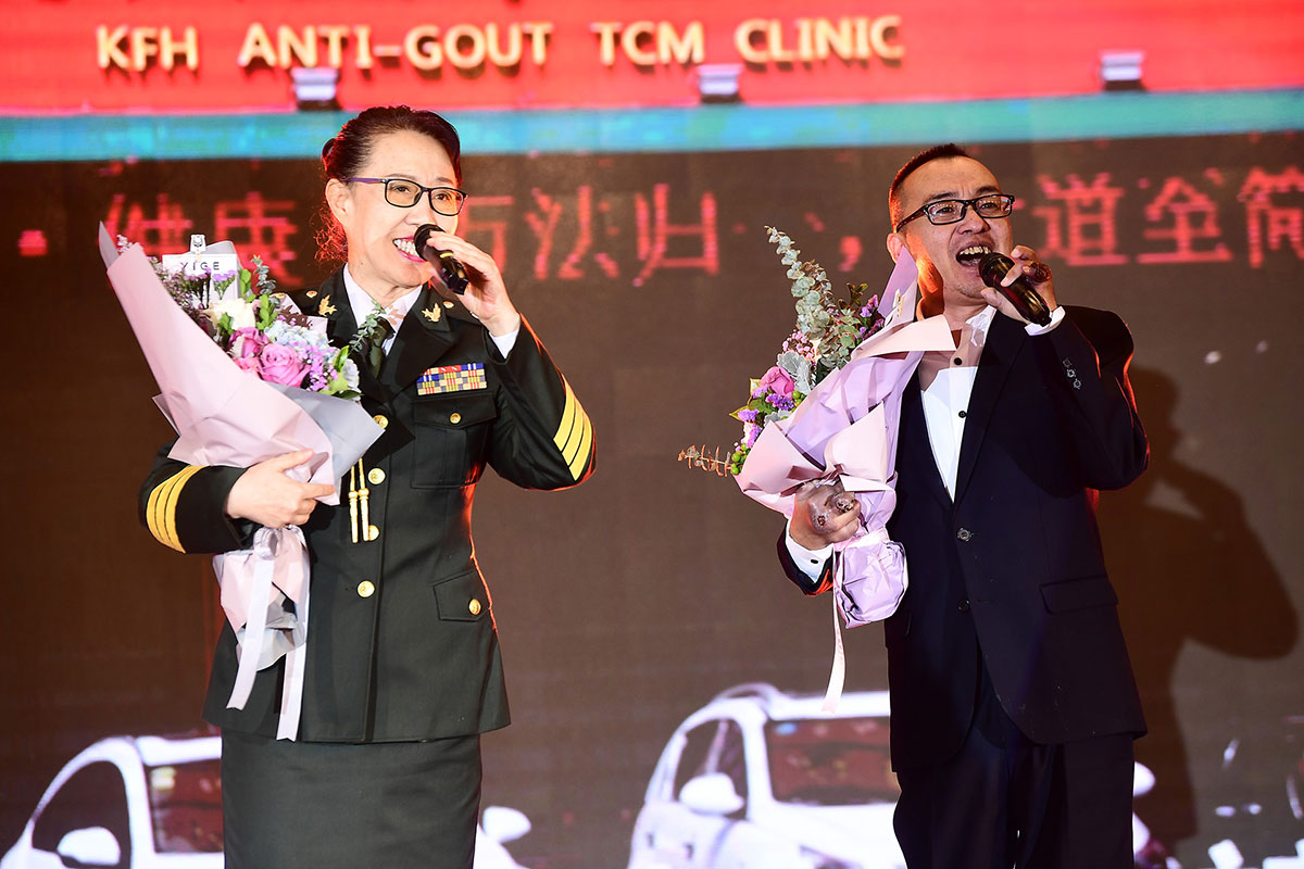 慶典現(xiàn)場最感人的一幕要數(shù)兩位“抗風(fēng)斗士”葛晟杰和關(guān)海強(qiáng)登臺(tái)分享一路與痛風(fēng)抗?fàn)幍男穆窔v程。他們都是風(fēng)華正茂,卻備受痛風(fēng)折磨,在遇到抗風(fēng)竤之前,幾乎都瀕臨絕望。來自山東的25歲葛晟杰,痛風(fēng)七年、癱瘓三年,經(jīng)過在抗風(fēng)竤門診的系統(tǒng)治療后,丟掉輪椅和雙拐,自己走上了舞臺(tái);關(guān)海強(qiáng)更是在被多家三甲醫(yī)院診斷“不截肢就有生命危險(xiǎn)”,并且還面臨著多臟器衰竭的風(fēng)險(xiǎn),抗風(fēng)竤醫(yī)療集團(tuán)張汭鈞董事長冒著極大的風(fēng)險(xiǎn),向他伸出救助之手。如今的關(guān)海強(qiáng)不僅恢復(fù)了生命活力,而且還走上舞臺(tái)為大家吉他彈唱,重獲新生的他最想感激的就是張汭鈞董事長、程莉琂總裁以及全體抗風(fēng)竤人給了他重獲健康的希望!