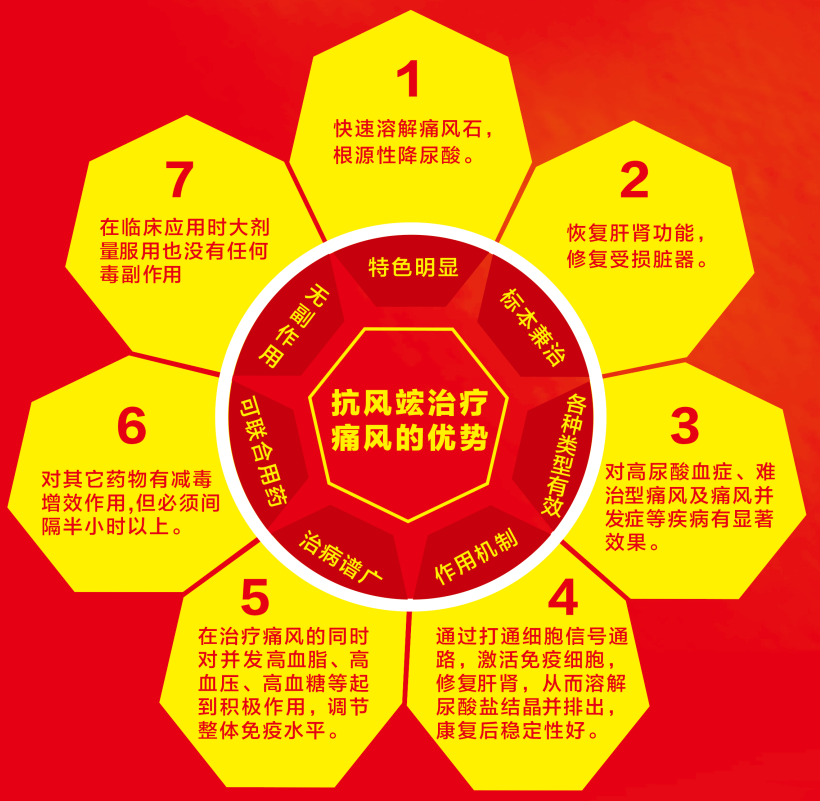 抗風竤之所以受到市場如此多的關(guān)注,正是因為抗風竤的產(chǎn)品優(yōu)越于藥物,綠色、安全、尊重自然,彌補了痛風治療領(lǐng)域中,藥物和手術(shù)的不足,不用手術(shù)取石,避免患者受到二次傷害,其中包含以下優(yōu)勢:
